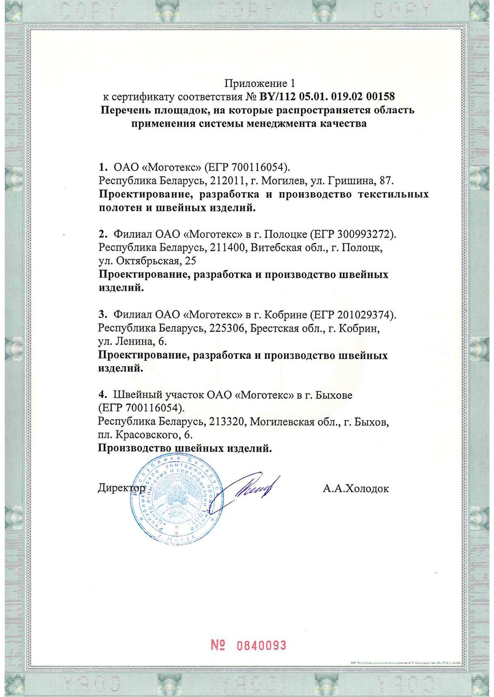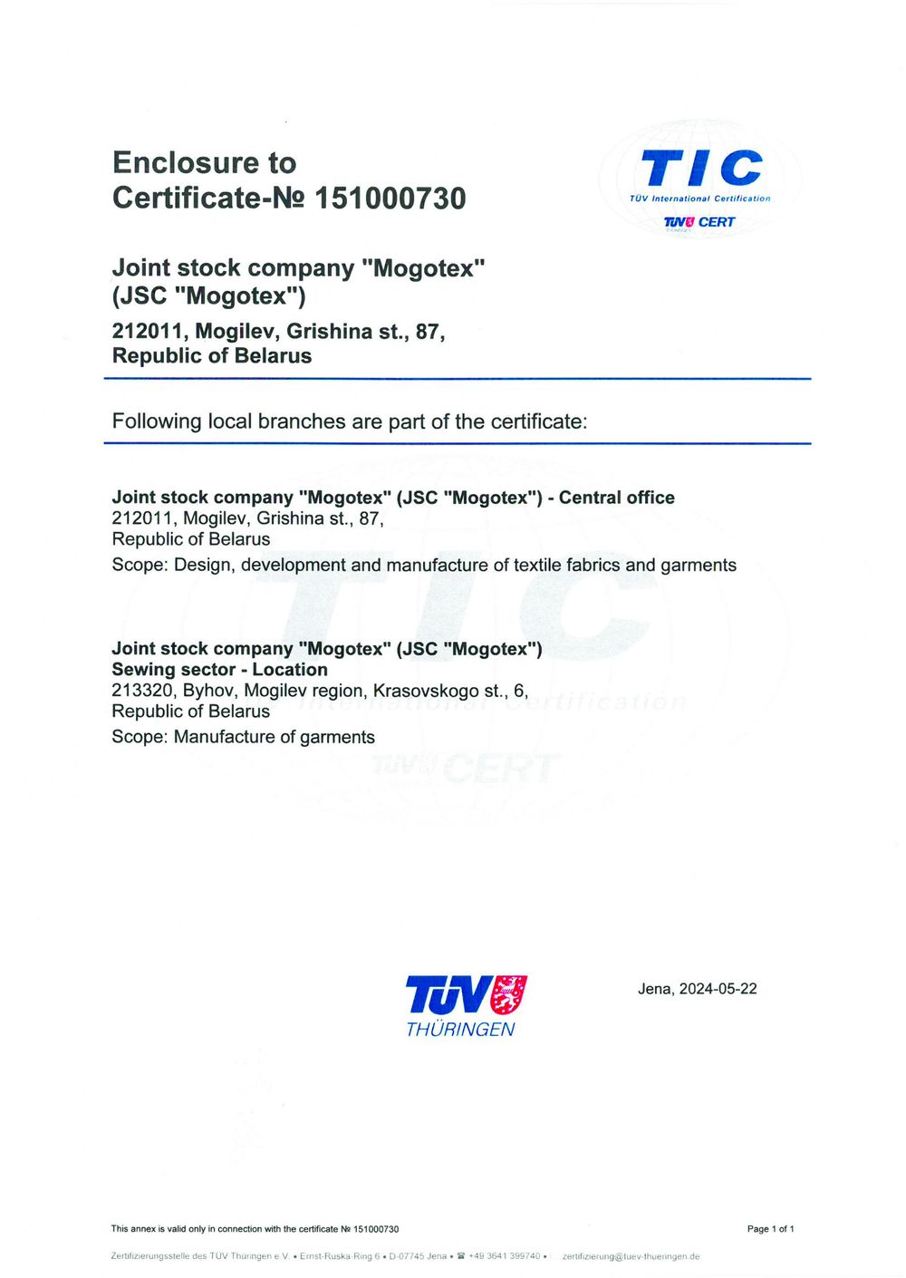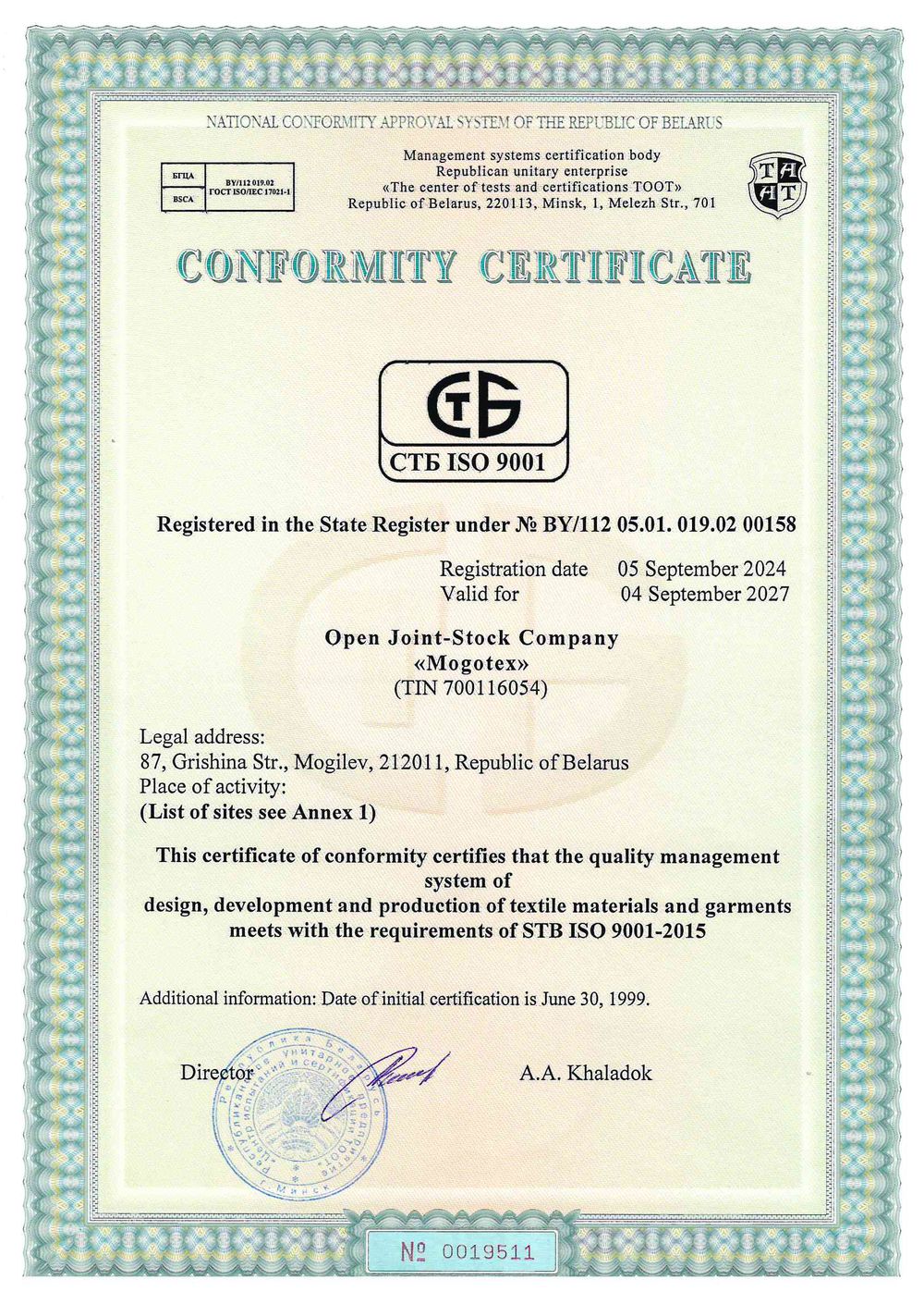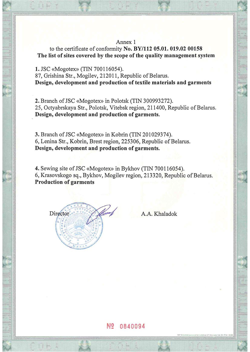 Соответствие продукции ОАО «Моготекс» требованиям Технических регламентов Таможенного союза ТР ТС 017/2011 «О безопасности продукции легкой промышленности» и ТР ТС 019/2011 «О безопасности средств индивидуальной защиты» подтверждено декларациями о соответствии и сертификатами соответствия.